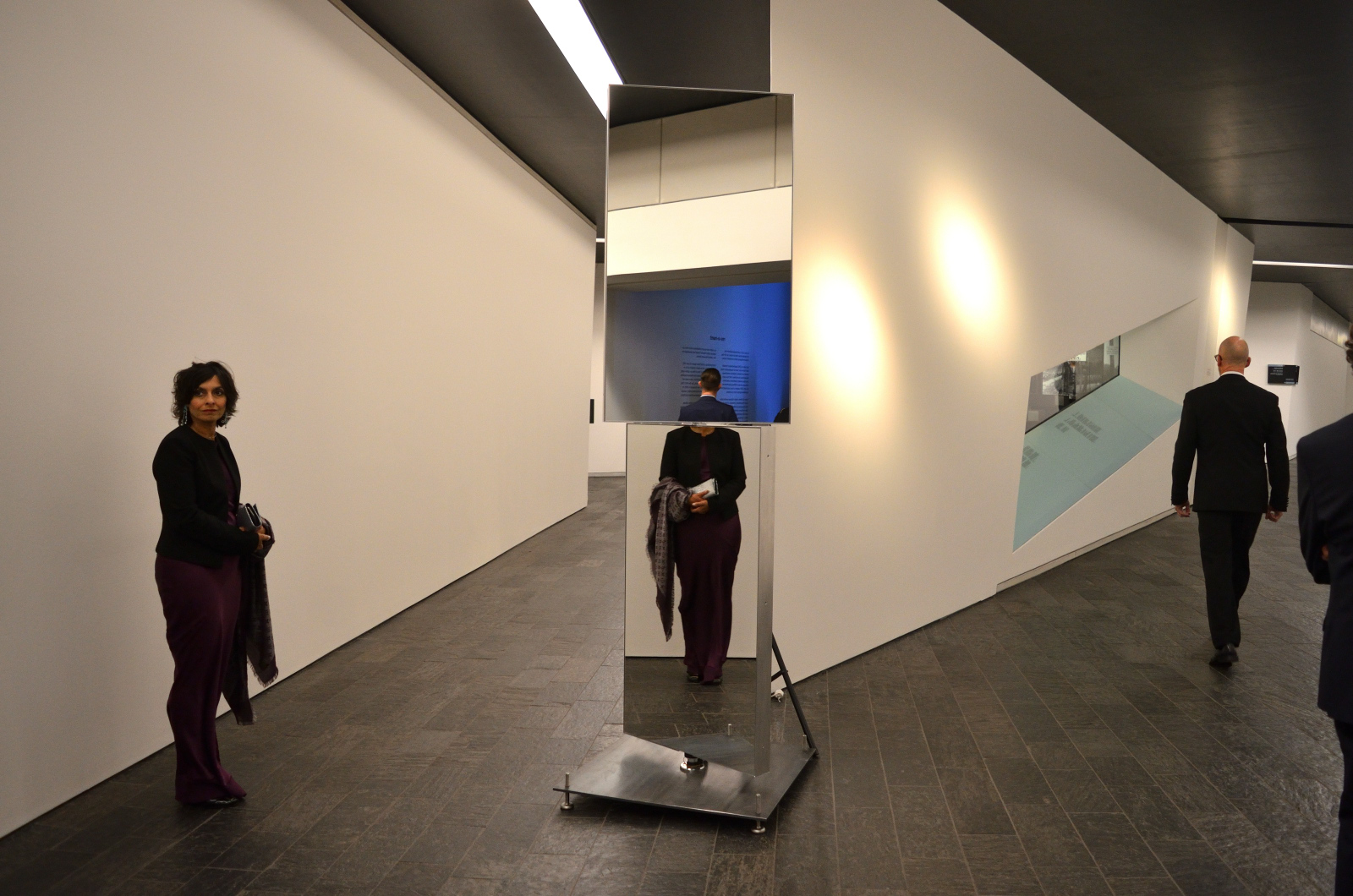 Drei 2-teilige, sich jeweils gegeneinander langsam drehende Spiegelelemente sowie eine mit den Spiegelelmente gekoppelte, zentrale Lichtinszenierung mit drei Stroboskop-Blitzen waren weitere Bestandteile der Installation.